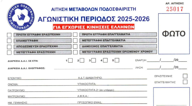 ΠΑΡΑΛΑΒΗ ΝΕΩΝ ΕΝΤΥΠΩΝ ΑΙΤΗΣΕΩΝ ΜΕΤΑΒΟΛΩΝ ΠΟΔΟΣΦΑΙΡΙΣΤΩΝ